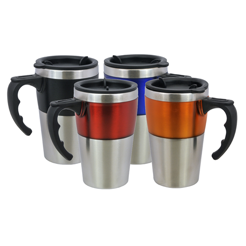 The Lancaster Travel Mug features a tall body, horizontal translucent plastic coloured stripe, stainless steel double wall exterior and stainless steel interior, large grip handle, easy open/close lid for a convenient no spill travel and large space for your printed promotional branding, message or logo customised onto the promotional product and to suit your individual promotional marketing or advertising requirements, great for practical client or customer gifts, in office use, corporate meetings, functions, conferences, trade shows, conventions, sales staff or corporates on the go representing your brand, specialised events, trades people, promotional events, seasonal gifts and promotional campaign giveaways where your new and exciting advertising message needs an attention grabbing promotional product that will deliver your details with impact, getting your promotional message out into the market place with guaranteed continuous brand exposure.